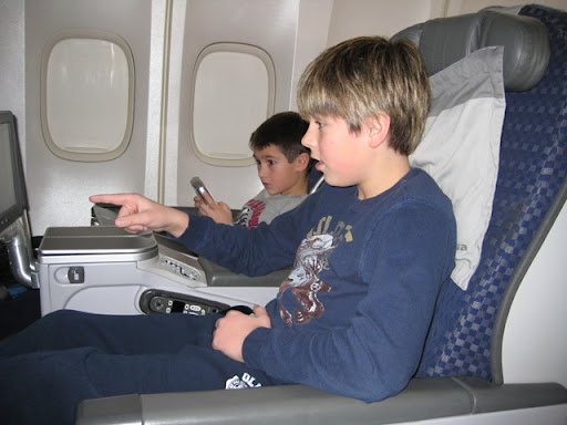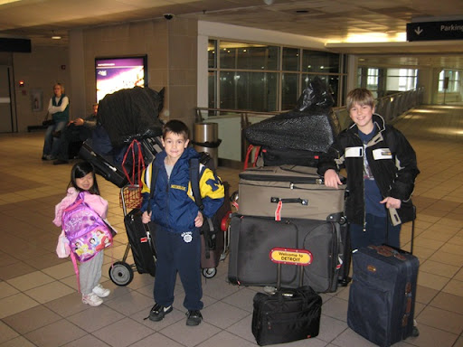 We left our house on Saturday afternoon for the last time. It was an unfamiliar feeling leaving our home, a foot of snow on the ground, the kids said their last goodbyes. We spent our last night at a hotel next to the airport. Our last dinner was at the Old Country Buffet as the Pizzeria Uno we tried to go to had recently closed. Our attempt to watch one last American movie (Enchanted) failed, we resorted to Nancy Drew through the hotel PPV. The kids still got their popcorn!