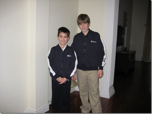 On Monday, the 28th the boys started school at Concordia.  School starts at 8am - a HUGE change for the boys as their old school started at 9am.  Waking up Monday morning was rough for all - the alarm went off at 6:30am.  After a slow start & a lot of nudges from Mom to hurry up & get ready, the boys were ready to head to the bus - a novelty for them as I used to drive them to school & pick them up (not so easy to do here with only 1 car & Ron needing to get to work - guess I could make him go to work REAL early.....).  Off to school...first day!!